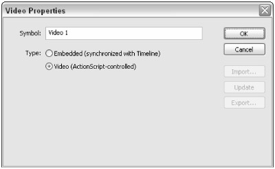 Open the Library panel (Ctrl+L or z+L). Click the options menu of the panel (in the top-right corner) and choose New Video. In the Video Properties dialog box, choose Video as the Type option (see Figure 17-42). Click OK.