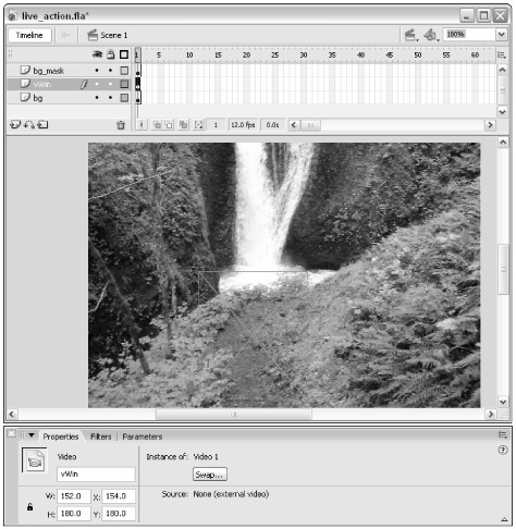 Create a new layer named vWin, and place the layer above the bg layer. Repeat Steps 7 and 8 from the previous exercise, creating a new Video object on frame 1 of this layer.
