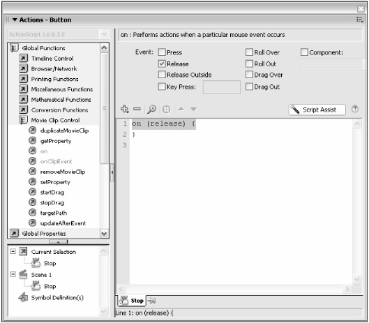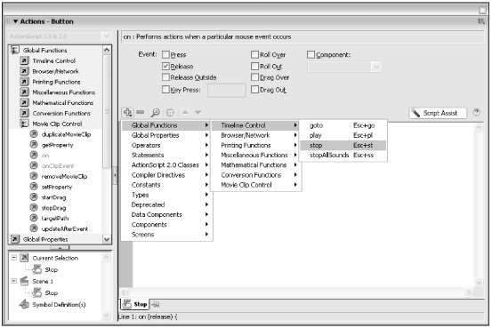 With the Stop Button instance selected, open the Actions panel (F9). Click the Script Assist button, and open the Global Functions ð Movie Clip Control booklet in the Actions toolbox.