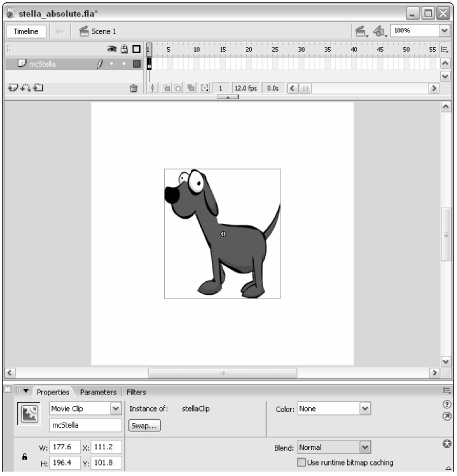 Select the instance of the stellaClip symbol on the Stage, on the Main Timeline. Open the Property inspector, and name the instance mcStella in the <Instance Name> field, as shown in Figure 19-4. Rename the stella layer to mcStella as well.