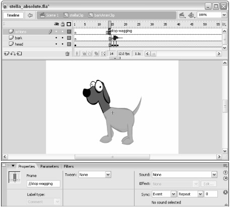 On the barkAnimClip timeline, create a new layer and rename it actions. Place this layer at the top of the layer stack. On frame 14 of this new layer, insert an empty keyframe (F7). Frame 14 is the frame just before the Stream sound on the bark layer begins. On frame 14, you want to tell the mcTailAnim instance to stop playing. So, let's give this keyframe a frame comment that indicates this behavior. With the keyframe selected, open the Property inspector and, in the <Frame Label> field, type //stop wagging, as shown in Figure 19-5.