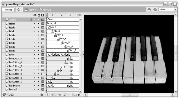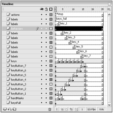 The timeline for the keysClip symbol has several layers for individual Button instances and labels. If you test this movie using Control ð Test Movie (Ctrl+Enter or z+Enter), you'll see that the Button instances over each piano key will tell the Playhead of the keysClip timeline to go to that key's frame label. For the first key on the left, the button on layer keyButton_1 has the following action list: