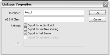 Link each sound in the library, so that the sounds can be referenced by ActionScript (and behaviors). Open the Library panel (Ctrl+L or z+L) and right-click, or Control+click on Mac, the key_1.wav (or key_1.aif) file. Choose Linkage in the contextual menu. When the Linkage Properties dialog box opens, select the Export for ActionScript check box. Change the auto-filled text in the Identifier field to key_1. Refer to Figure 19-10. When you are finished, click OK to accept the settings.