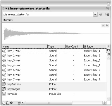 You can refer to the pianoKeys_sounds.fla file located in the ch19/pianoKeys folder of this book's CD-ROM. This file has the seven sound files in the Library panel, sorted in the keySounds folder. |