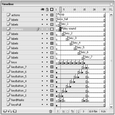 Now that you have an understanding of what's happening in this Movie Clip, let's create some sounds with the Behaviors panel. These sounds will be targeted within the mcKeys instance later in this chapter.