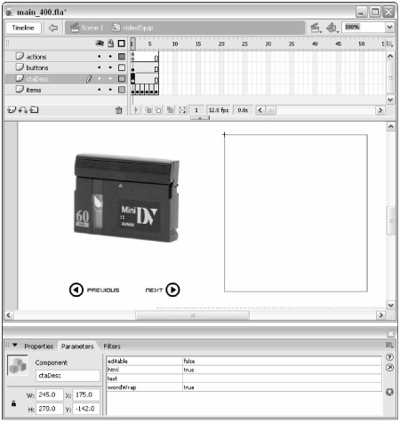Use the Free Transform tool to stretch the component instance. This instance should accommodate several lines of text, as shown in Figure 20-17. The size of the instance should match the size of the text area you wish to display in the scrolling text window. In the Property inspector, name the TextArea instance ctaDesc. In the Parameters tab of the inspector, change the html setting from false to true. The html setting controls whether or not the instance should interpret HTML tags. Also, change the editable setting to false; the user should not be able to change the contents of the text field at run time.