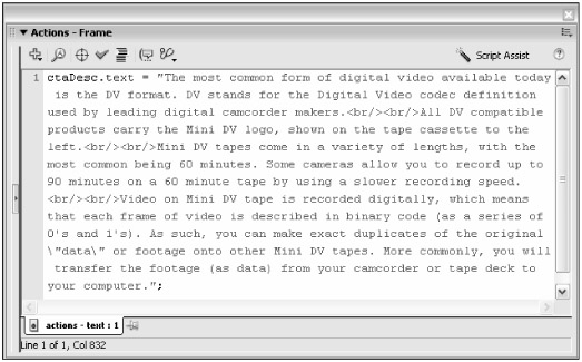 Now, you're ready to set up the text for the second item on the videoEquip timeline. Select frame 2 of the actions text layer, and press F7 to insert an empty keyframe. Add the same actions and text as shown in Steps 5 and 6, but this time, copy and paste the text from the item_2_formatted.txt file (located in the ch20/text folder of this book's CD-ROM).