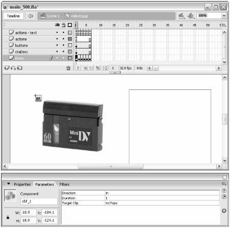 You can view the default settings for the BlurFader component instance in the Property inspector. Select the component instance at the top-left corner of the mcTape instance, open the Property inspector, and click the Parameters tab. This component has three options, as shown in Figure 20-19: Direction (in to fade in the targeted instance, out to fade out the targeted instance), Duration (how long the transition should last, in seconds), and Target Clip (the Movie Clip instance that the BlurFader component instance has snapped to).