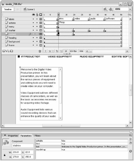 On frame 10 of the content layer, drag an instance of the TextArea component to the left side of the Stage. In the Property inspector, name this instance ctaIntro. Change the html setting from false to true, and set the editable setting to false.