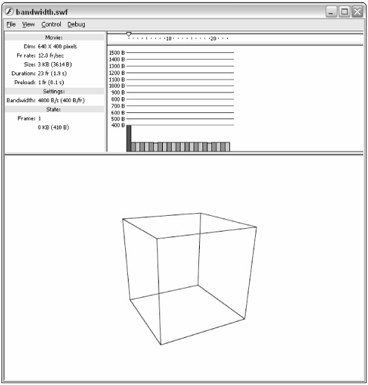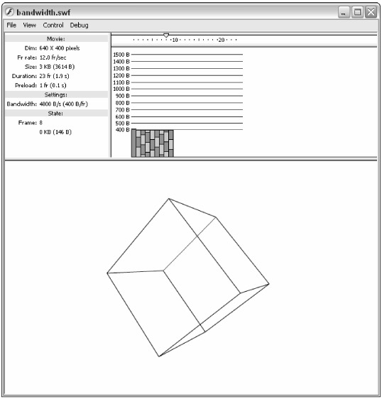 Use the Control menu to play (Enter key) or rewind (Ctrl+Alt+R or z+Option+R) the test movie. Rewinding pauses the bandwidth.swf movie on the first frame. Use the Step Forward (. or > key) and Step Backward (, or < key) commands to view the Flash movie frame by frame. If a Flash movie doesn't have a stop() action on the last frame, the Loop command forces the player to infinitely repeat the Flash movie.