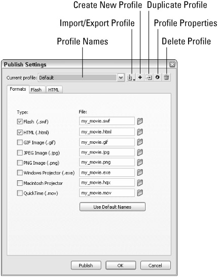 To choose, create, modify, or delete profiles, open the Publish Settings dialog box (File ð Publish Settings). At the top of the dialog box, you will find the Profile features available in Flash 8. Refer to Figure 21-12 and the following description list.