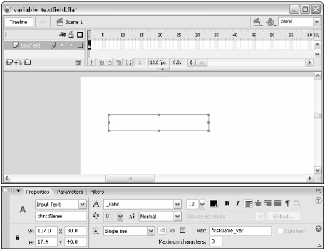 Save your Flash document as variable_textfield.fla, and test it (Ctrl+Enter or z+Enter). In the Test Movie window, type your name into the tFirstName text field. Then, choose Debug ð List Variables. Among other information, you will see the following lines of text: