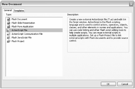 Create a new ActionScript document in Flash Pro 8 by choosing File ð New, selecting ActionScript File in the General tab of the New Document dialog box (see Figure 26-5), and clicking OK.