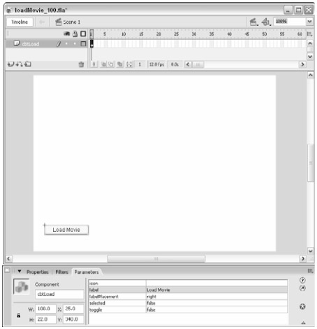 You can find the completed example file, loadMovie_100.fla, in the ch28 folder of this book's CD-ROM. |