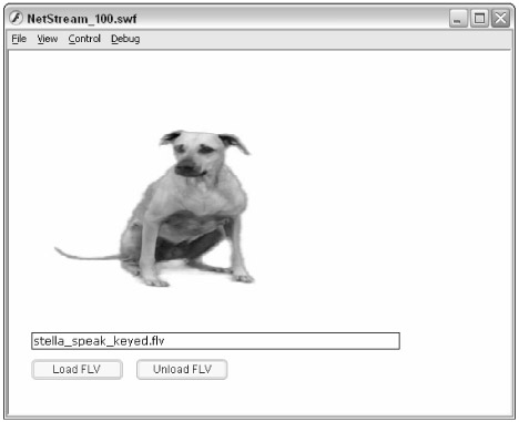 Save your Flash document. Make sure you have copied the stella_speak_keyed.flv file from the ch28 folder of this book's CD-ROM to the location where you saved the Flash document for this exercise. Test the movie (Ctrl+Enter or z+Enter), and type the text stella_speak_keyed.flv into the tVid field. Click the Load FLV button, and the video will play in the vWin instance (see Figure 28-21). If you click the Unload FLV button, the playback stops and the image no longer appears in the nWin instance.