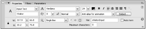 In the Property inspector, select Input Text in the top-left menu. In the <Instance Name> field, type tVisitor. In the Var field, enter the text sVisitorInput. Click the Show Border option as well. Refer to Figure 29-1 for these settings.