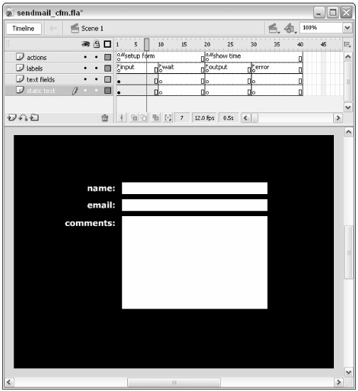 In this section, you create a Flash form that submits user-entered information to a server-side ColdFusion script that e-mails the data to an e-mail address that you specify in the script. By accessing a remote ColdFusion script, you make a Flash movie with five data exchange states: input, send, wait, output, and error. You learn how to submit name/value pairs from Flash to remote URLs and learn how to check the receipt of variables from the ColdFusion script using the LoadVars object. The LoadVars object can detect the loading of the external variable data.