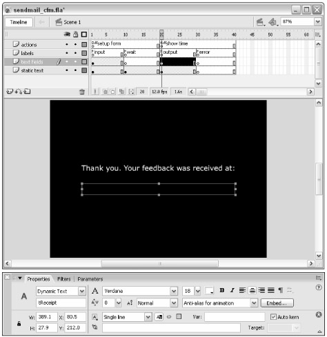 You can see that you are setting up the output state to display the time that the server received the data (Figure 29-4). The ColdFusion script returns the time and date of the receipt to the Flash movie. On frame 20 of the text fields layer, create a Dynamic text field with an instance name of tReceipt and place it underneath the Static text you just made.