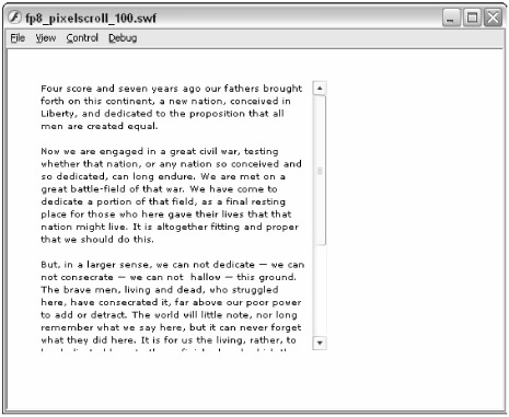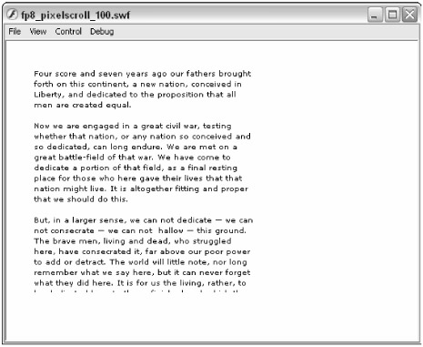 You can find the completed file, fp8_pixelscroll_100.fla, in the ch30/scroll folder of this book's CD-ROM. You can see a more advanced example, fp8_pixel scroll_101.fla, in the same location. That version dynamically creates the MovieClip instance (mcHolder) and the tDisplay instance, and populates the field with text from the gettysburg.as file. |