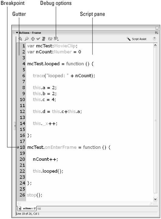 Perhaps one of the most useful features of the Debugger panel is the option to set and use breakpoints. A breakpoint is a position in your ActionScript code that halts playback of a movie while you are in Debug mode.