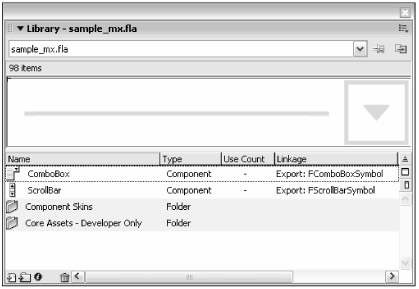 A component is made up of one or more internal assets. One of the changes introduced with Flash MX 2004's component architecture (and continued in Flash 8), though, is that components can be compiled. This means that when you add a component to the Flash document and open your Library panel, you'll only see one symbol for the component (see Figure 33-1). In Flash MX, the same component may have added many folders and symbols that are used by the component (see Figure 33-2).