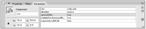 Select the instance, and open the Property inspector. Name the instance cxc. Click the Parameters tab, and change the URL value to video.xml. Change the direction value to receive — for this sample, you only load XML data into the Flash movie. No data is sent from the Flash movie. Review the settings shown in Figure 34-1.