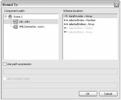Select the cxc instance on the Stage, and go back to the Component Inspector panel. Select the Bindings tab. Click the plus ( + ) button to add a new binding. In the Add Binding dialog box, select the item array, as shown in Figure 34-3. This property will be bound to the List component you added earlier. Click OK.