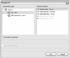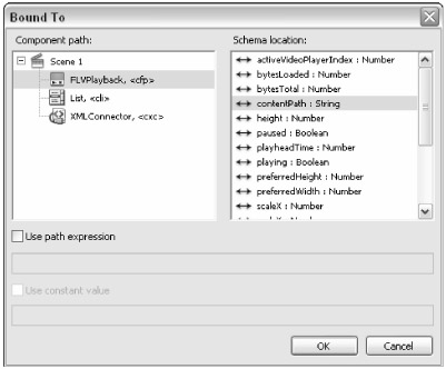With the new binding selected in the Bindings tab, double-click the bound to field. In the Bound To dialog box, select the cfp instance in the Component path column. Then, choose the contentPath property in the Schema location column. The data property of the selected item in the List component contains the path to the .flv file, which needs to be passed into the FLVPlayback component to initiate playback (refer to Figure 34-9). Click OK. The Bindings tab should now look like the one in Figure 34-10.