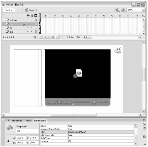 Select the FLVPlayback instance, and name it cfp in the Property inspector. Click the Parameters tab, and choose a skin for the component. For this example, use the SteelExternalAll.swf skin, as shown in Figure 34-6. Also, use the Free Transform tool to stretch the width and height of the List component to line up with the FLVPlayback component.