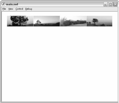 Save the main_starter.fla document, and test the movie (Ctrl+Enter or z+Enter). If the PHP script files are uploaded and correctly specified in the frame 1 script, the thumbnail images load into the ScrollPane instance of the Gallery component, as shown in Figure 35-6. Note that the scroll bar for the ScrollPane instance does not automatically appear — you'll fix that in a later section.