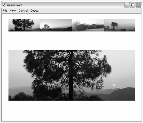 Go back to the main_starter.fla document, and test it (Ctrl+Enter or z+Enter). After the thumbnails load, click the first thumbnail image. The full-size JPEG then loads into the Loader component of the Gallery component, as shown in Figure 35-7.