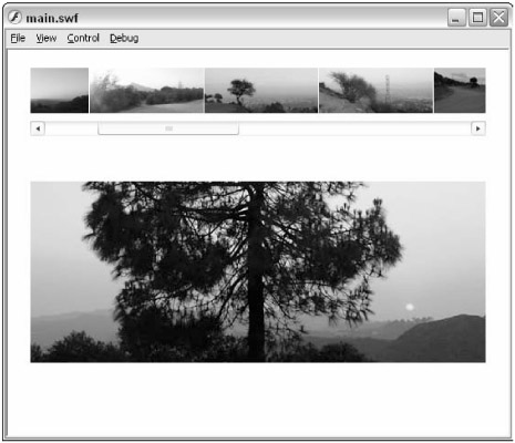 Go back to the main_starter.fla document and test it (Ctrl+Enter or z+Enter). When all of the thumbnails have loaded, the horizontal scroll bar for the ScrollPane instance should display, enabling you to scroll to more thumbnail images. Refer to Figure 35-8.