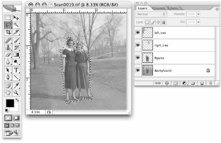 To illustrate this technique, we'll start with a simple photograph. We've chosen an old family snapshot that includes elements at different distances from the camera. As shown in Figure 36-13, this image includes two figures with some landscape elements that recede naturally into the background.