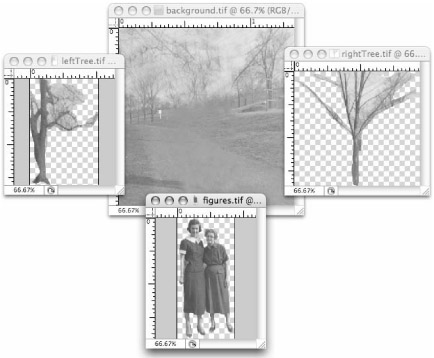Using selection tools in Photoshop, we roughly cut out three key elements to establish the different depths of the image: the figures (layer 1), the tree on the right (layer 2), and the tree on the left (layer 3). Copying and pasting each of these elements onto its own layer enables you to fine-tune the silhouettes by adding masks to each of the cutouts. Of course, if you just animated these elements on top of the original photo, you would get doubled-up images that would interfere with the illusion of depth. One solution would be to use the figures and the trees on top of some other background or on white for a more abstract effect. However, we want to keep the context of the original photo, so we put the clone tool to work and "fudged" the background to create a complete surface that we can layer the cutouts on top of. The final result of our work in Photoshop is four separate files, as shown in Figure 36-14.