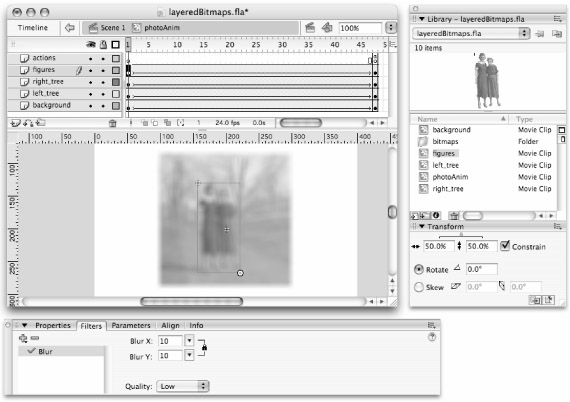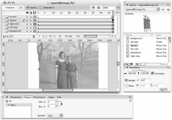 By adding a tween to scale each element so that it appears to move at a slightly different speed, we can create the illusion of a zoom into the image with depth. If we started the animation with all the elements at 100-percent scale and scaled them up to create a zoom effect, the bitmaps would get very pixilated and jagged. The solution is to start with the images at a smaller size in the first frame of the tween. Select each Movie Clip in the first keyframe of each layer and use the Transform panel to set the starting scale at 50 percent. To enhance our tweened zoom effect, we also added a Blur filter to each Movie Clip with varying levels of Blur. The specific settings that you use will depend on the images you're using and the effect you want to achieve, but the basic idea of our example is to create a zoom animation that takes the images from a wide shot (small and blurry) to a close-up (bigger and sharper). Compare the final keyframe of the tween shown in Figure 36-16 with the first frame that was shown in Figure 36-15 to get a better idea of the transformations that were applied to each element.