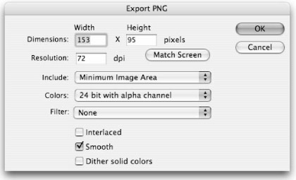 Every raster image format in Flash's Export Image dialog box has the same basic options, and all pertain to the image size, resolution, and bit depth (or number of colors) for the exported image. You can also trim any unused Stage area from the final exported image. As you will see in the next section, for each specific raster format there are other unique settings in addition to the main options we describe here: