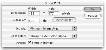 Options: The PICT Export dialog box displays only one other option. The options that are displayed vary depending on the Color depth setting.