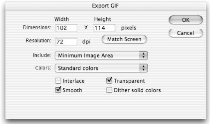 The check box options in the Colors section of the Export GIF dialog box (see Figure 36-19) are discussed in the "Using the GIF settings" section in Chapter 21, "Publishing Flash Movies." The Colors drop-down menu is slightly different, however. Also, as we mentioned in a previous note, the Publish Settings in the Macintosh version of Flash do not create adaptive GIF images (even if you have selected the option to do so).