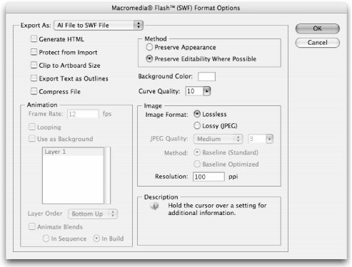 In the Flash (SWF) Format Options dialog box (shown in Figure 37-10), you can choose how you want your Illustrator artwork to translate to .swf format. The Format Options dialog box has the following settings: