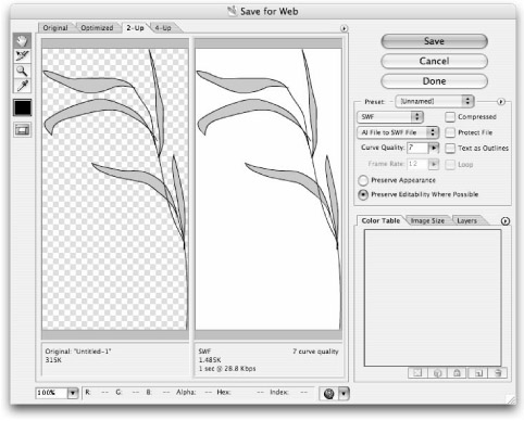 Since version 10, Illustrator has included the handy option of using the File ⇨ Save for Web command to invoke the Save for Web window (as shown in Figure 37-11). This enables you to preview how your file will appear with different export settings. Although the settings are not as extensive as those in the Format Options dialog box (described previously), the Save for Web dialog box does enable you to alter the file's dimensions and to see a preview of how the file size is affected by the different Curve Quality settings.