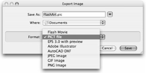 If you are unsure of the format to use in your graphics program, refer to Table 37-1. Afterward, we show you the steps for exporting artwork in a Flash frame as a static vector image.