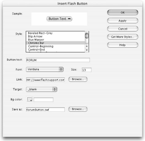 If you can't find a button style that suits you, click the Get More Styles button to connect to the Macromedia Exchange site to download even more button styles.
