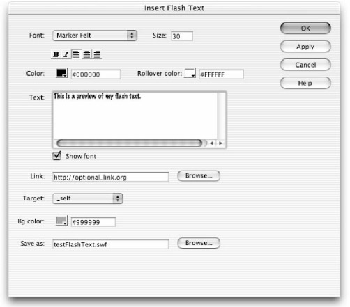 Using the Insert Flash Text dialog box, follow these steps to format and insert your text: