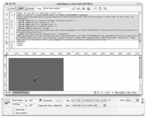The sample file that we used for this example is stella_raw.flv; you can find it in the FlashVideo_example subfolder of the ch38 folder on the CD-ROM. To see the finished HTML file with the Dreamweaver playback component, open stella_live.HTML from the same location. |