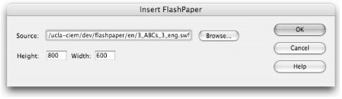 If you leave the Width and Height value fields blank in the Import FlashPaper dialog box, the original dimensions of the document will be preserved when it loads into Dreamweaver. |