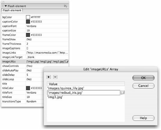 To specify the images that will be displayed in your Image Viewer presentation, click once in the text area to the right of the imageURLs parameter listing. This makes the text field active so that you can manually edit the array, but it also makes a very small icon visible at the far right of the text of the Tag inspector. This button invokes the Edit Array dialog box, as shown in Figure 38-15.