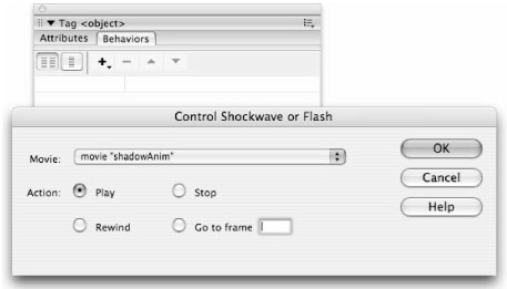 This enables simple JavaScript control of a Flash movie, telling the movie to Play, Stop, Rewind, or Go To a certain frame. You can apply these behaviors to regular HTML images or hyperlinks and use them to control the timeline of your Flash movie.