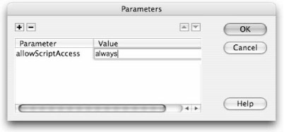 Another way of making sure that JavaScript will be able to control the Flash content is to set a Parameter for any Flash items that you want to target. Select the Flash preview in the Design window, then click the Parameters button in the Property inspector to launch the Parameters dialog box. As shown in Figure 38-25, enter the Parameter name allowScriptAccess in the left column and a Value of always in the right column. This will automatically add a new line of code to the existing parameters (defined in the Code window) for the selected Flash content.