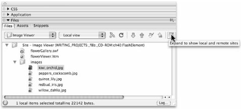 Since Dreamweaver MX, this is no longer a limitation. You can change links even in Flash movies (.swf). The Files panel (Window ð Files, or F8) includes drop-down menus for choosing a site that you want to view and for setting a view style. In Dreamweaver 8, there is now tabbed access to the Assets panel and a new Code snippets panel. As shown in Figure 38-26, you can use a button on the top-right edge of the Files panel to expand the Files panel. Clicking this button ungroups the Files panel from Assets and Snippets (which remain open in the background), and loads some additional view options into the Files panel.