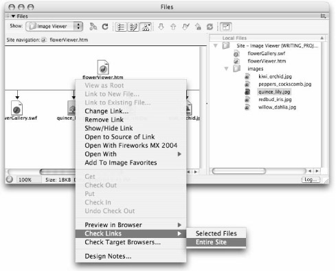You can check all the links in the site, including links within Flash movies, by right-clicking in the Site Map area of the Files panel and choosing Check Links from the contextual menu. You can also choose Site ð Check Links Sitewide from the application menu, or use the Ctrl+F8 or z+F8 shortcut keys. You can check the entire site or just a subset of folders.